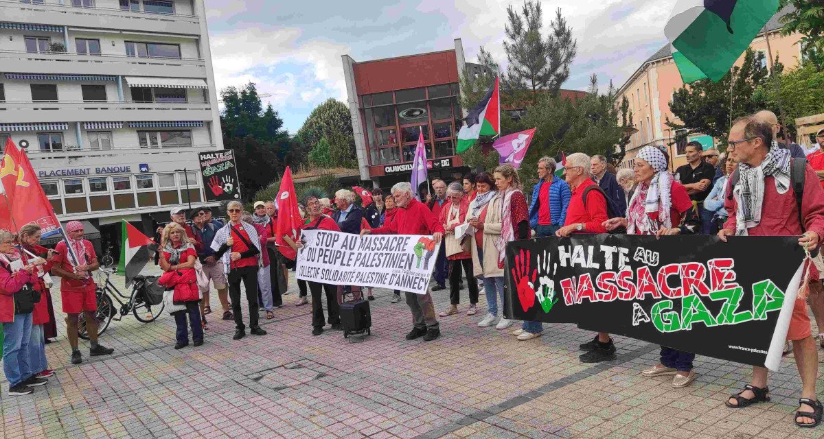 Une centaine de participant-es se sont rassemblées pour la Palestine le 8 juillet à Annecy à l’appel de nombreuses organisation dont l’AFPS 74. La consigne était que tous-tes soient habillé-es en rouge afin de former une ligne rouge symbolique car toutes les lignes rouges ont été franchies à Gaza.
