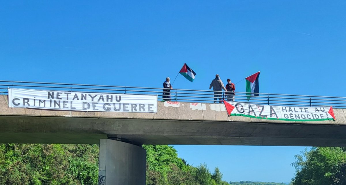 Les rassemblements pour exiger l’arrêt du génocide à Gaza se poursuivent à Lannion mais pour augmenter la visibilité de la Palestine dans le paysage du Trégor, l’AFPS Trégor est maintenant également présente avec banderoles et drapeaux sur certains ponts de Lannion, en fin de journée, quand le trafic est dense.