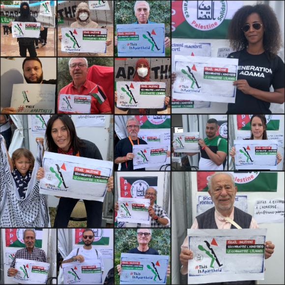 Envoyez des selfies à l’AFPS afps@france-palestine.org avec le visuel de campagne ou le #ThisIsApartheid pour constituer une vaste mosaïque qui sera diffusée à l’issue de la quinzaine.