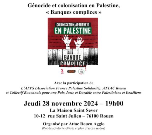 Accueil > Mobilisation > Agenda global > France > Seine Maritime > Café Attac / Génocide et colonisation en Palestine : "Banques complices"