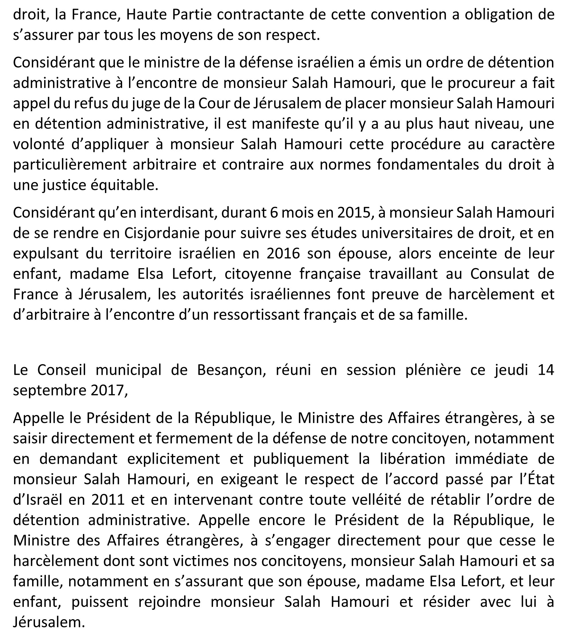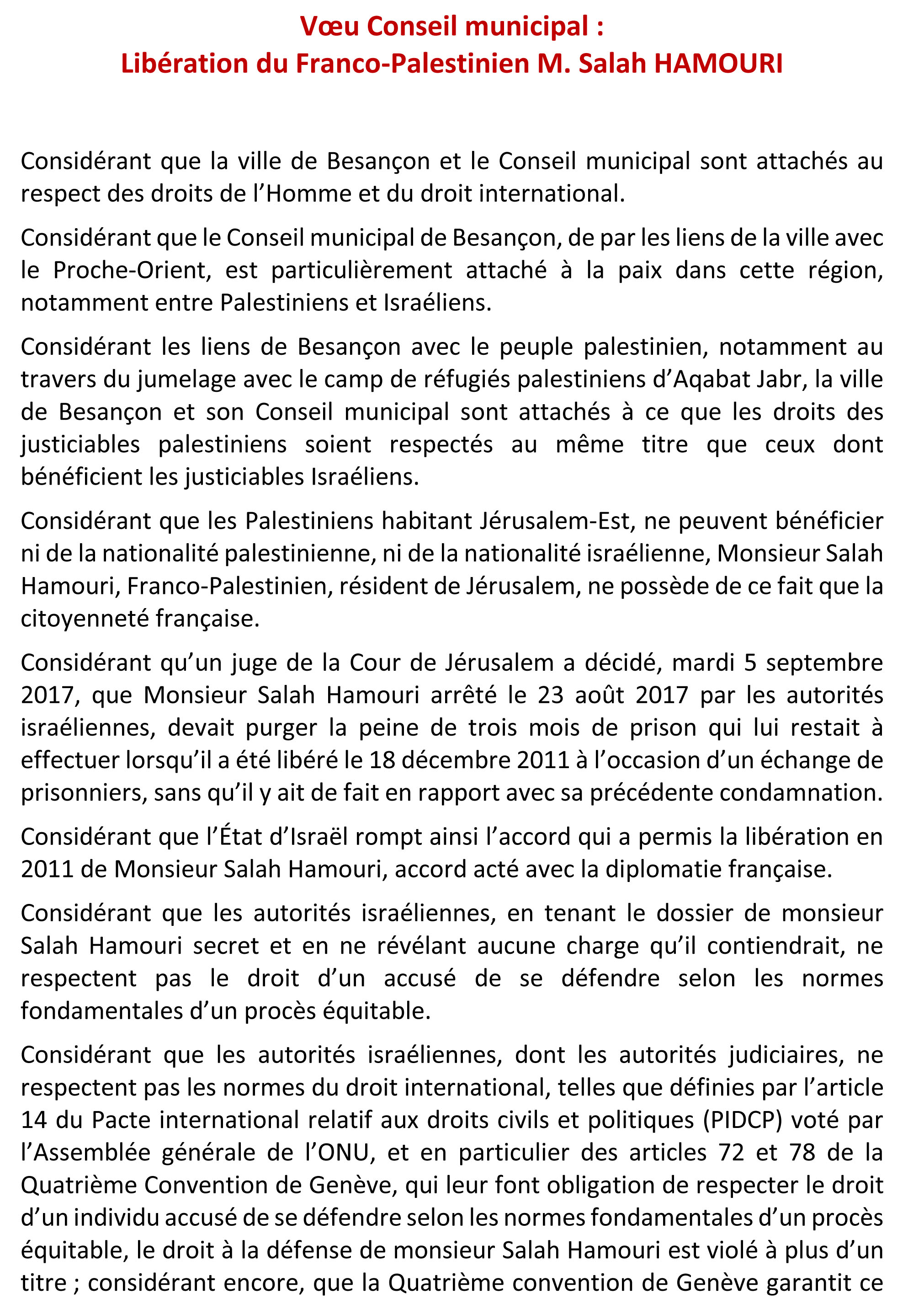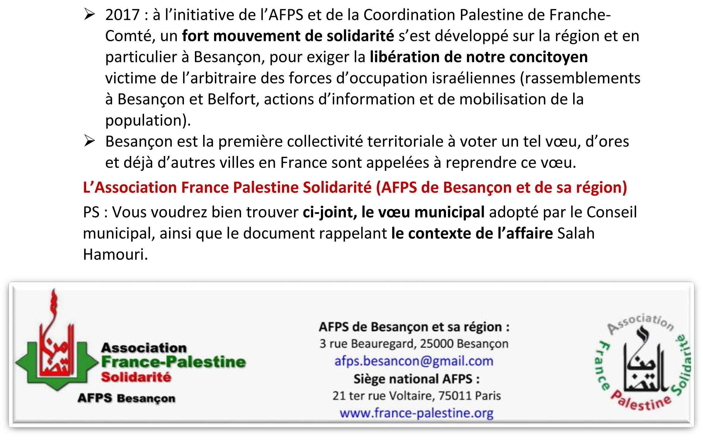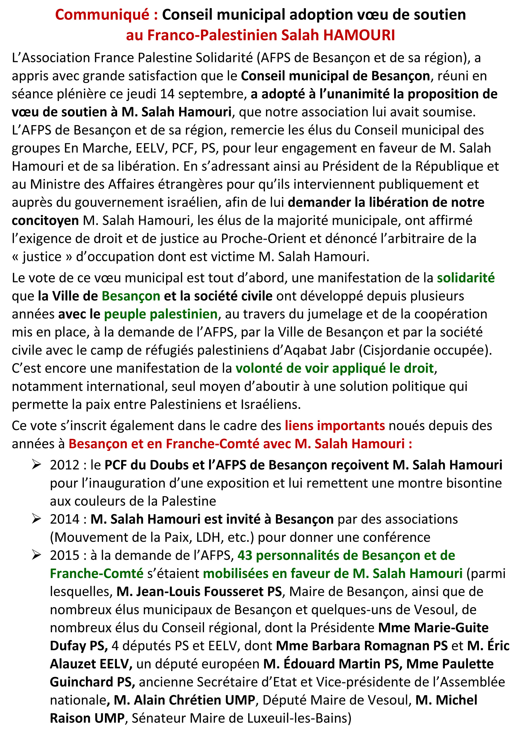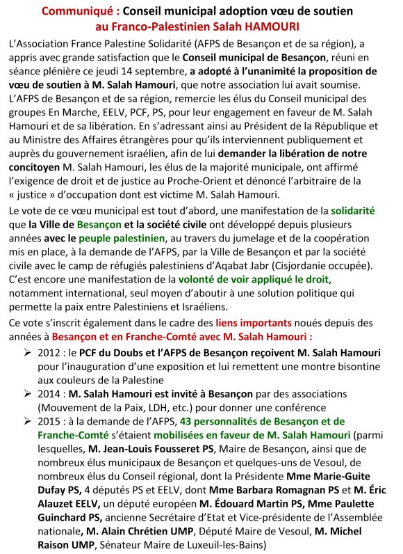 Le Conseil municipal de Besançon, réuni en séance plénière ce jeudi 14 septembre, a adopté à l’unanimité la proposition de vœu de soutien à M. Salah Hamouri, que l’AFPS de Besançon et de sa région lui avait soumise. Par ce vœu le Conseil municipal de Besançon demande au Président de la République et au Ministre des Affaires étrangères d’intervenir auprès du gouvernement israélien pour la libération de notre concitoyen M. Salah Hamouri.