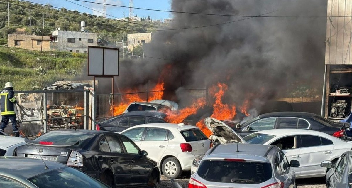 Photo : Les colons israéliens incendient des véhicules appartenant à des Palestiniens à Deir Sharaf, 22 mars 2026 © Al-Jarmaq News