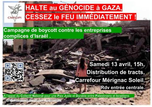Samedi 13 avril à 15 heures devant le Carrefour Mérignac Soleil entrée centrale 52 avenue de la Somme