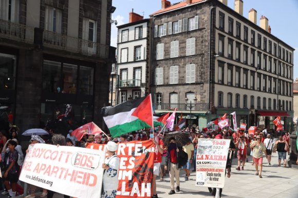 Plusieurs arrêts ont jalonné le parcours. Devant la mairie, le FPRA, organisation révolutionnaire et antifasciste de Clermont-ferrand, a pris la parole pour réclamer la libération de Georges Ibrahim Abdallah, le plus ancien prisonnier politique d’Europe, enfermé par la France. Solidaires a ensuite lu le communiqué de soutien des 34 organisations pour Zoé, militante clermontoise du Collectif Intifada, inculpée pour avoir publié son soutien à la résistance palestinienne, et informé sur la création d’une cagnotte en ligne pour ce procès. Les manifestant.es se sont ensuite arrếtés devant un magasin Carrefour puis un Mac Donald, dénonçant leur soutien au génocide.