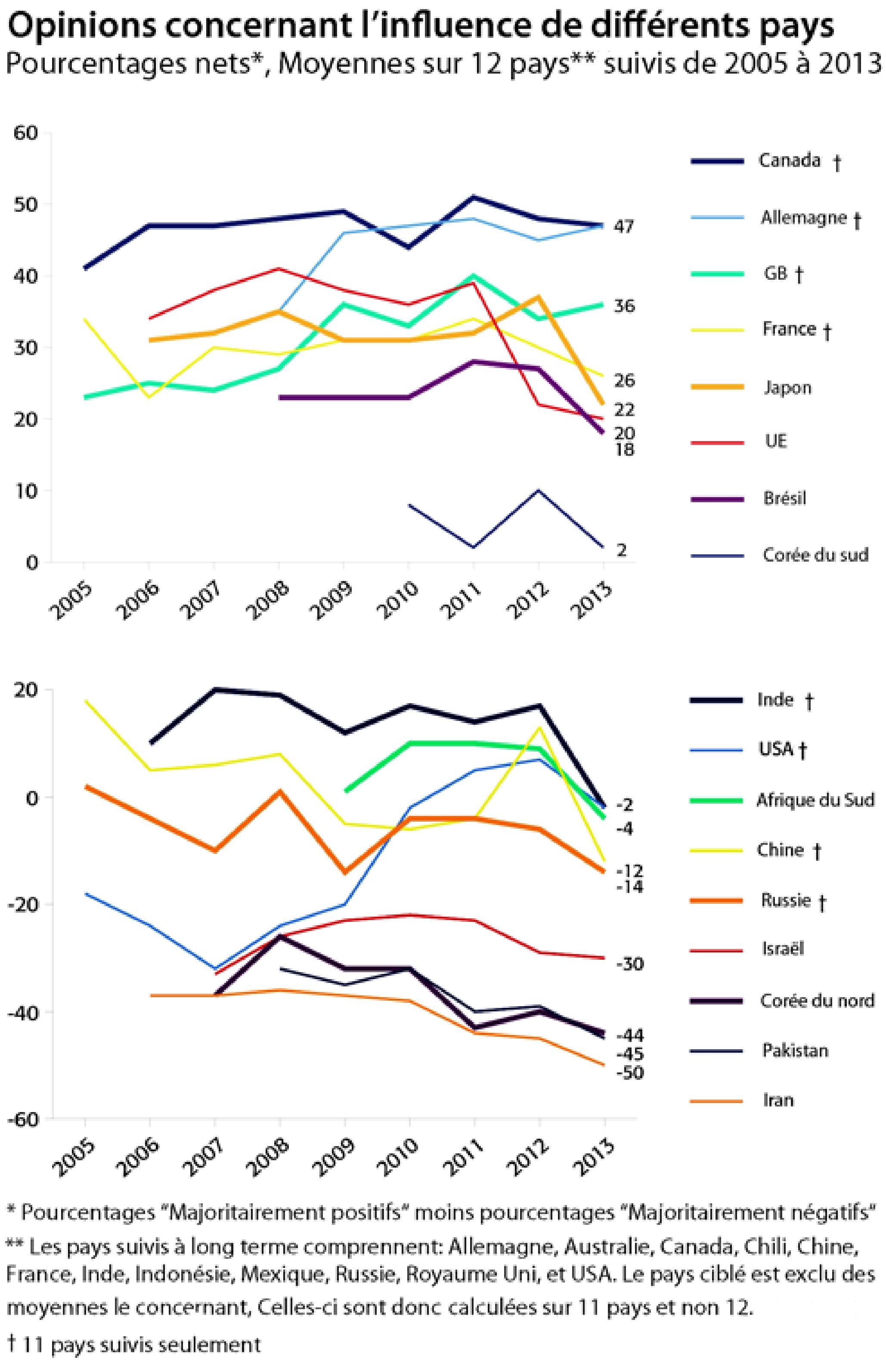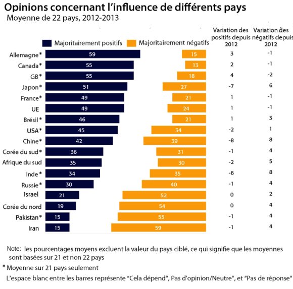 – Des 25 pays sondés en 2013, 20 penchent pour une opinion négative, 3 pour une opinion positive, et 2 sont partagés ;