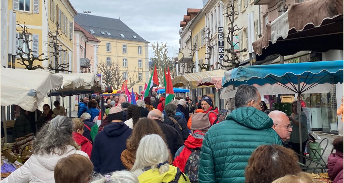 Les manifestant-es ont été accueilli-es par les organisateurs de la fête du Folk qui se tient sur l’Esplanade : ils/elles ont pu y prendre la parole et leur intervention a été suivie par une danse dédiée à Gaza. Puis la manifestation traditionnelle dans les rues de la ville s’est déroulée sans problème ponctuée par la lecture de « brèves » extraites du journal Haaretz et par un chant final.