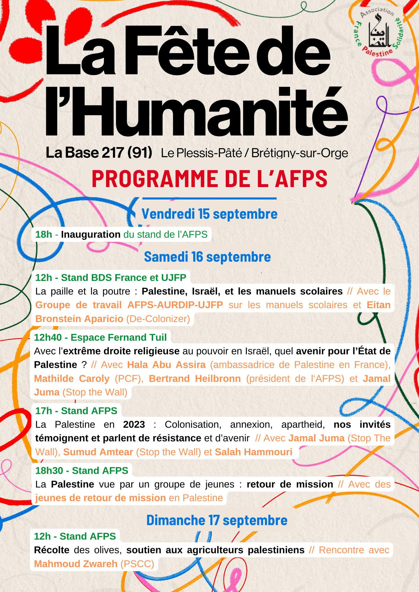 La Palestine sera présente et l’AFPS bien visible ! Notre stand est situé au "Village du Monde" Place Salvador Allende et rue Marwan Barghouthi. Venez nous rencontrer, l’occasion de discuter en musique autour d’une bière et dattes palestiniennes, découvrir des ouvrages sur la Palestine, rencontrer des militant.e.s de France et de Palestine, assister à des conférences, s’engager pour la cause palestinienne et même devenir adhérent.e.s.