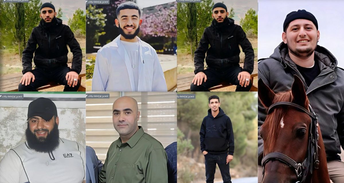 Ils s’appelaient : Nour Abdel Karim Mohammed Al-Baytawi (34 ans), Shawqi Muhammad Abd Al-Nabi (42 ans), Ibrahim Yassin Ahmed Bani Odeh (24 ans), Reda Kamel Mahmoud Bani Odeh (22 ans), Islam Azmi Hussein Bani Odeh (22 ans), Saher Nabil Bisharat (23 ans), Wadih Ayad Ahmed Bani Odeh (19 ans), Ayman Abdel Hadi Qadeeh (56 ans), Bilal Talal Salama (24 ans) et Muhammad Ismail Al-Astal (46 ans).