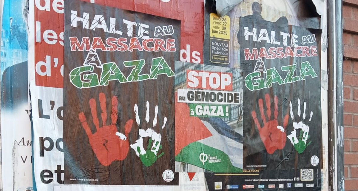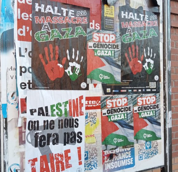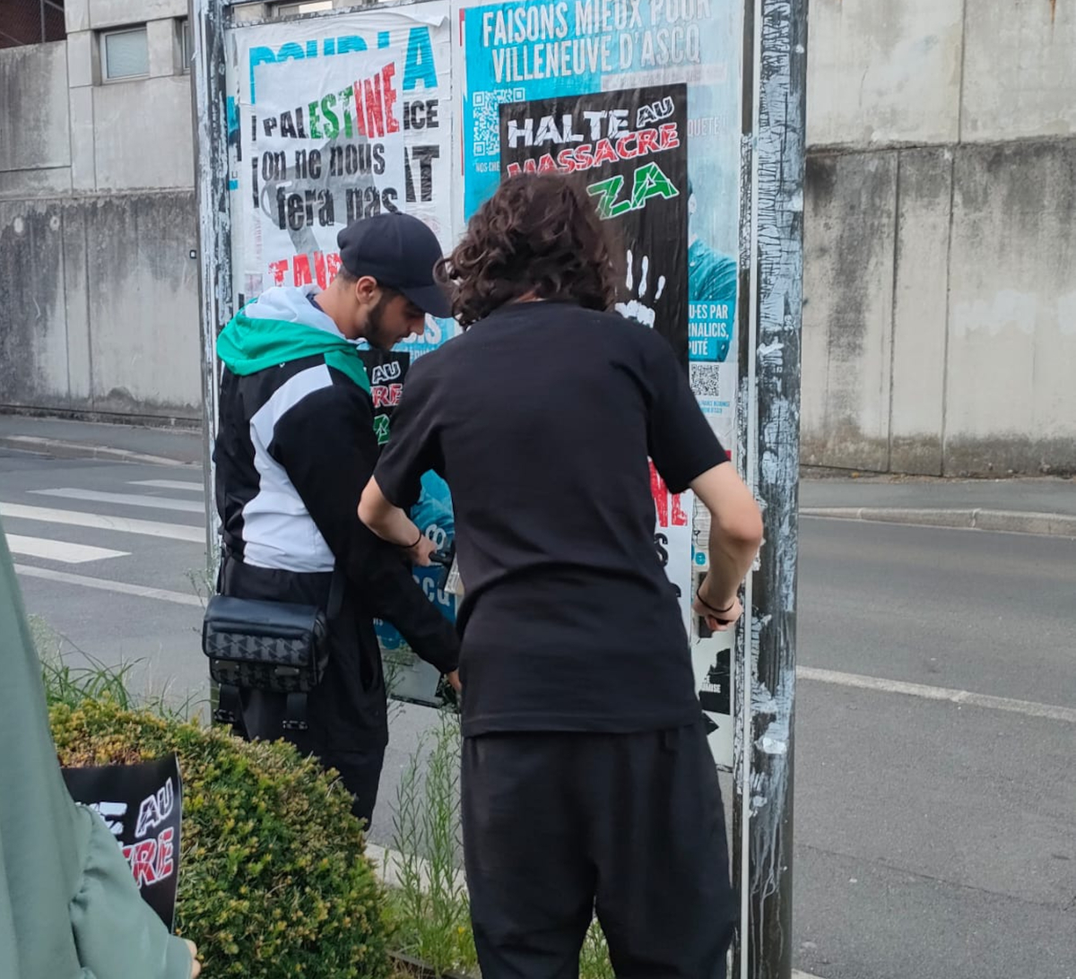 Vendredi 8 août 2025, quatre adhérentes de l’AFPS de Villeneuve d’Ascq aidées de deux jeunes passants ont poursuivi les collages dans les rues de Villeneuve d’Ascq. Elles ont même eu le soutien des chauffeurs de bus qui passaient à proximité !