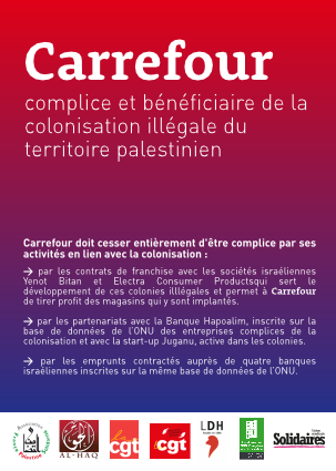 En effet, il y a bientôt deux ans, le groupe CARREFOUR a engagé un partenariat avec deux sociétés israéliennes dans le but de développer ses activités en Israël. Ces sociétés ainsi que d’autres sociétés du même groupe sont fortement impliquées dans la colonisation israélienne illégale de la Palestine.