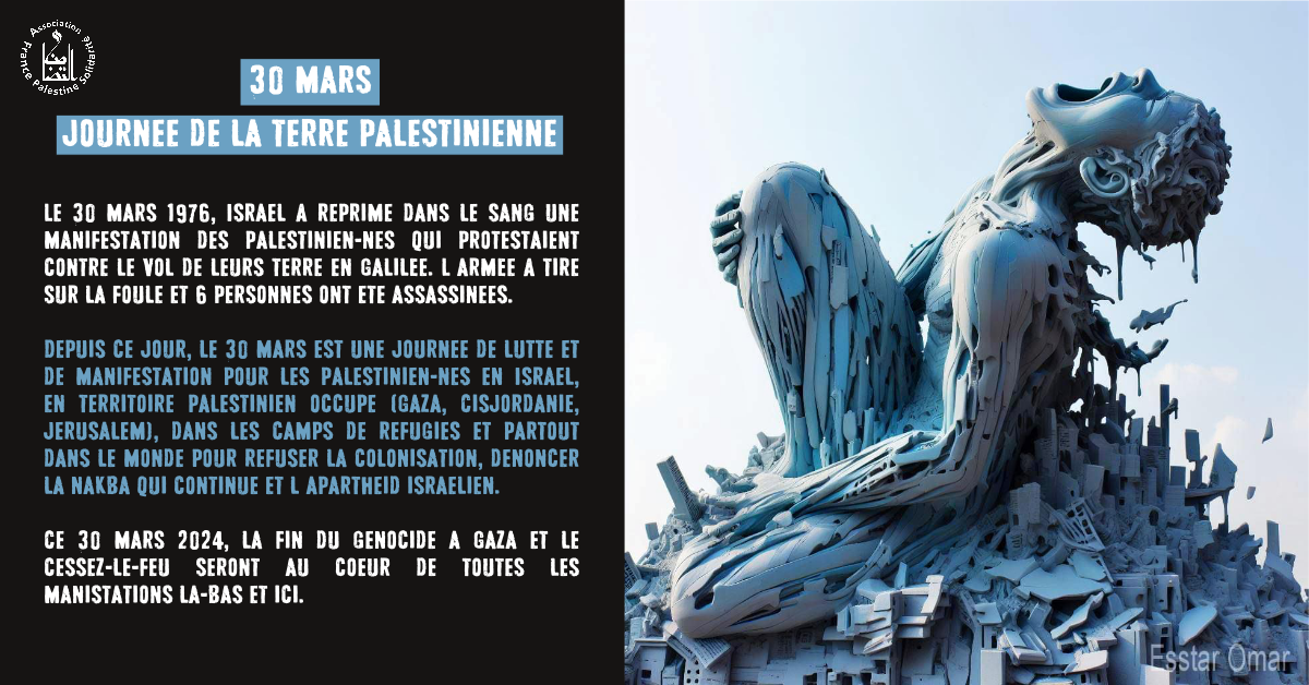 Le 30 mars 1976, la police israélienne tire sur des Palestiniens qui manifestaient contre la confiscation de leurs terres. Bilan : six morts, des dizaines de blessés et des centaines de détenus. Le 30 mars est devenu pour tous les Palestiniens et Palestiniennes dans le monde la « Journée de la Terre ». Elle est le symbole de leur attachement à leur terre, de leur résistance et de leur lutte contre l’occupation et la colonisation. Cette année, nous commémorons le 48ème anniversaire de la Journée de la Terre qui prend un caractère particulier avec le génocide en cours dans la Bande de Gaza qui dure depuis plus de cinq mois sans discontinuer.