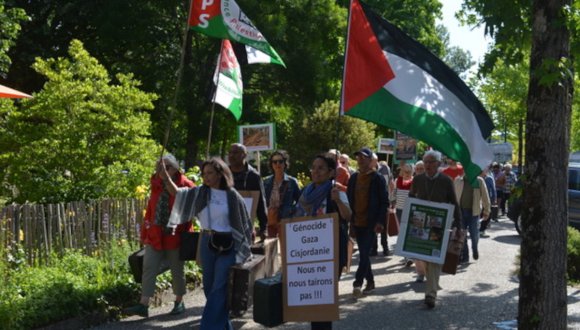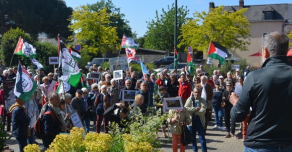 Un défilé dans les rues avec pancartes, banderoles et valises figurant la Nakba s’est terminé devant la mairie par des prises de paroles de l’AFPS, du député de la circonscription, de la vice présidente du conseil départemental et du maire de la commune.