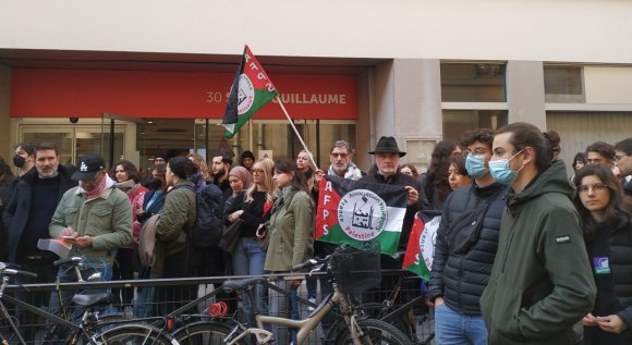 Les militant-es de l’AFPS Paris 14-6 se sont associés au rassemblement organisé lundi 3 mars 2025 en soutien aux trois étudiant.e.s exclu.e.s récemment de Sciences Po Paris pour une durée de 30 jours, après quatre autres qui avaient été exclus en octobre 2024.