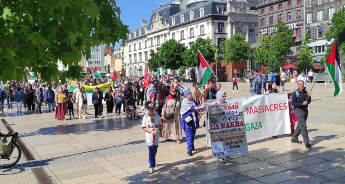 Après une minute de silence en mémoire des victimes, la foule a défilé dans les rues piétonnes du centre ville devant de nombreux passants, derrière des banderoles "La Nakba continue", "Halte aux massacres", "Stop annexion", "droit au retour des réfugiés" et de nombreux drapeaux, et slogans, notamment pour des sanctions et le boycott d’Israël. Elle a ensuite fait un arrêt devant une boutique Carrefour puis une boutique McDo, dénonçant leur soutien au génocide et enfin un tour de la place de Jaude, bien visibles du tramway et des terrasses de café sous le soleil printanier.