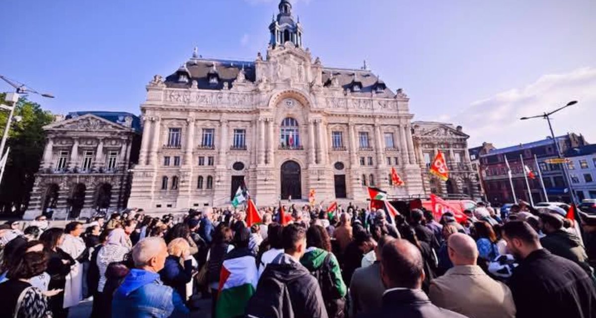 Jeudi 15 mai 2025 , à l’appel du collectif pour la palestine composé de l’AFPS Roubaix Tourcoing, d’ATTAC Roubaix Tourcoing, de l’Union Locale CGT Roubaix et de la FAL Roubaix), pus d’une centaine de personnes se sont rassemblées devant la Mairie de Roubaix pour réitérer leurs demandes à la Ville de Roubaix , à savoir qu’elle s’engage publiquement pour la Palestine et pour Qabatia, ville jumelée avec Roubaix, qu’elle commémore le 77eme anniversaire de la Nakba et dénonce sa poursuite à Gaza et en Cisjordanie, qu’elle transmette des demandes d’action concrètes et efficaces au gouvernement pour faire plier Benyamin Netanyahou et qu’elle réponde à l’appel national du Collectif Blouses blanches pour Gaza.