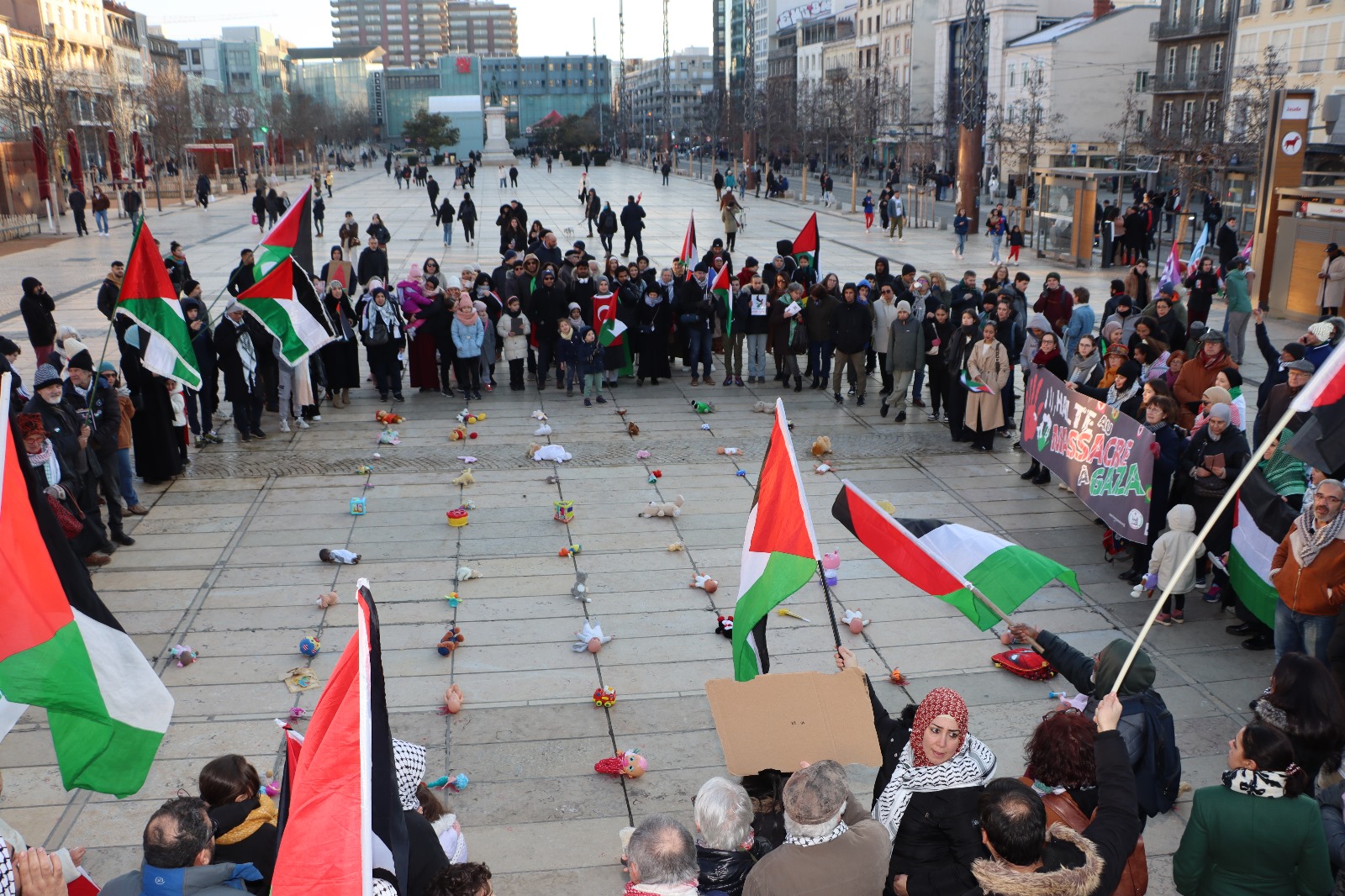 Le 20 janvier 2024, près de 500 personnes se sont rassemblées, sous un soleil froid, le samedi 20 janvier place de Jaude à Clermont-Ferrand pour exiger un cessez-le-feu immédiat, l’arrêt des massacres à Gaza et en Cisjordanie, et dénoncer le génocide en cours et la complicité des puissances occidentales, dont la France.