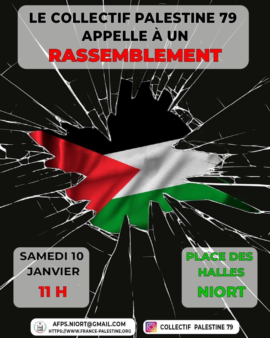 Membres du Collectif Palestine 79 : 4 ACG (Anciens Appelés en Algérie et leurs Amis Contre la Guerre), ACAT 79, Action populaire en Marais poitevin, ADIRP 79, AFPS 79, Amnesty International France Niort, Antifa 79, ARDDI, Association Culture Sahara, Bassines Non Merci 79 (BNM), CGT 79, CNL 79, Confédération Paysanne 79, CSF 79, EcoAvenir 79, FSU 79, Génération.s 79, La Cimade, LDH 79, Les Ecologistes 79, LFI 79, Libre Pensée 79, MJCF 79, NPA 79, PCF 79, POI 79, Révolution Permanente 79, Solidaires 79, Solidaires Par Nature, Union Juive Française pour la Paix (UJFP), UL CGT Melle.
