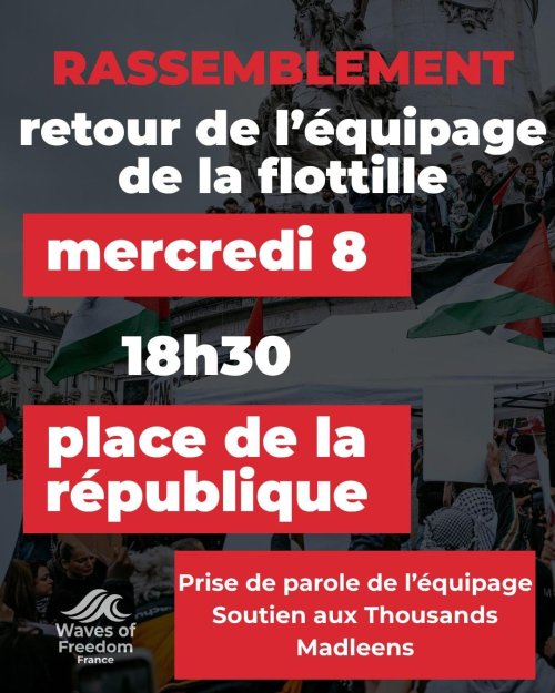 Ce mercredi 8 octobre à 18h30, retrouvons-nous place de la République à Paris pour rendre hommage aux citoyen-nes de la Global Sumud Flotilla qui viennent de rentrer et pour exiger la libération des équipages de la deuxième flottille