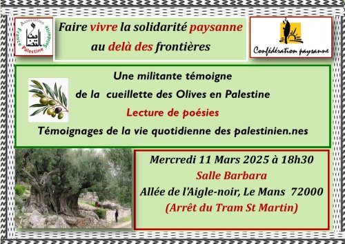 L’AFPS 72 et la Confédération paysanne 72 présentent une soirée sur la cueillette des olives en Palestine mercredi 11 mars à 18h30, Salle Barbara, allée de l’aigle noir au Mans.