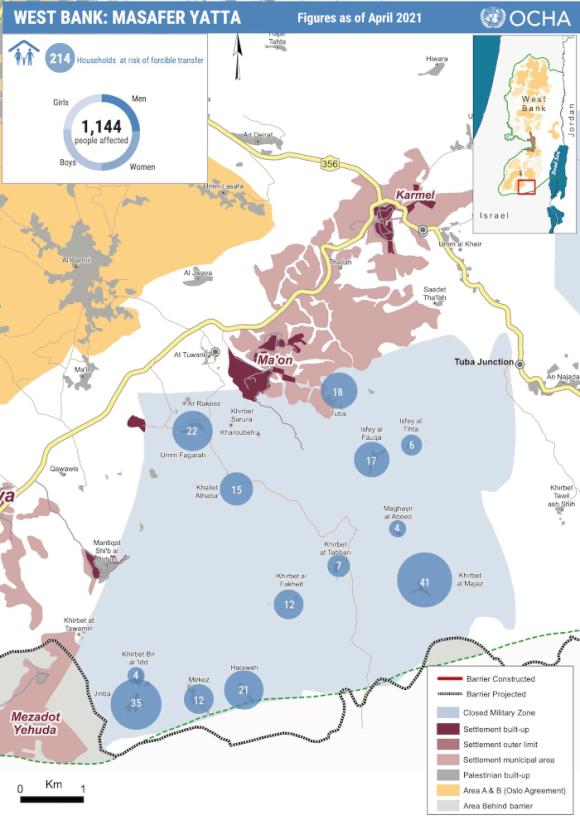 Situées dans le sud de la Cisjordanie, les 13 communautés de Masafer Yatta abritaient jusqu’à récemment 215 ménages palestiniens, soit environ 1 150 personnes. La région se trouve dans les 18 % de la Cisjordanie déclarés par les autorités israéliennes « zones de tir » et affectés à des entraînements militaires. Les personnes déplacées au cours des trois derniers mois représentent environ 7 % de la population.