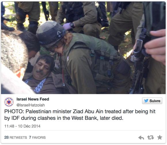 Chargé du dossier de la colonisation au sein de l’Autorité palestinienne, Ziad Abou Ein a été frappé au torse par des soldats lors d’une marche de protestation dans le village de Turmus Ayya, près de Ramallah, a indiqué une source de sécurité palestinienne. Il est mort lors de son transport vers la ville de Ramallah.