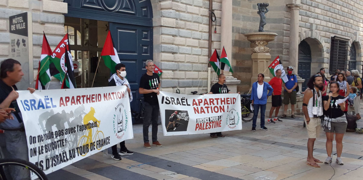 Plusieurs étapes ont jalonné le parcours, occasion d’aller vers le public et de distribuer près de 1000 tracts dénonçant l’opération de propagande politique de l’équipe Israël Start-Up Nation au Tour de France et affirmant que l’on ne roule pas avec l’Apartheid, mais qu’on le boycott. Des banderoles porteuses de ces messages ont été déployées et des prises de paroles et des slogans ont accompagnés ces haltes.