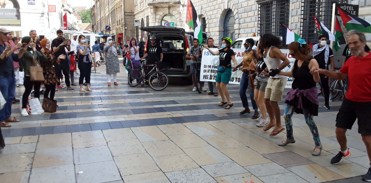 La manifestation a eu un caractère également festif, avec de la musique palestinienne, des chansons palestiniennes qui ont été chantés par une militante de l’AFPS tandis que d’autres militants ont entraîné les passants dans des danses traditionnelles debkeh. Le public a dans l’ensemble très bien accueilli l’initiative et a pris part aux danses, une passante a pris le micro pour pousser des youyou en solidarité avec la Palestine, les voitures ont klaxonnaient en les croisant.
